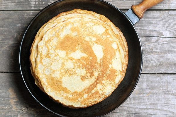Мама диктовала: на 20-25 блинов — 3 яйца, 12 столовых ложек муки с горкой, 4 столовых ложки растительного масла, щепотка пищевой соды, соли чуть, сахар не клади совсем, 2 стакана теплого молока и последним — стакан кипятка. Перемешать, без комочков.