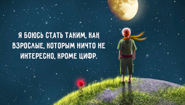 - Когда говоришь взрослым: «Я видел красивый дом из красного кирпича, в окнах у него герань, а на крыше голуби», – они никак не могут представить себе этот дом. Им надо сказать: «Я видел дом за сто тысяч франков». И тогда они восклицают: «Какая красота!»