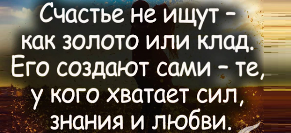 Тогда он будет счастлив и сможет подарить своё счастье и другим людям тоже. Со счастливым человеком всегда приятно. Он хорош, интересен, с ним легко. И, кстати, своей мудростью делает счастливыми и других, поэтому путь к счастью начните не с поиска другого человека, а с себя. И подведем черту словам одного мудреца:
