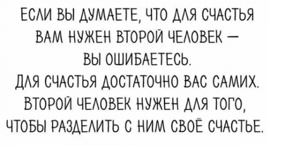 Когда он перестаёт с нами общаться, мы становимся самыми несчастными личностями, которые только есть на свете. И тогда не можем радоваться тому, чему радовались наедине с собой. Так что для счастья нам нужны только мы сами. Второй человек может только разделить его с нами, но не становиться причиной счастья.